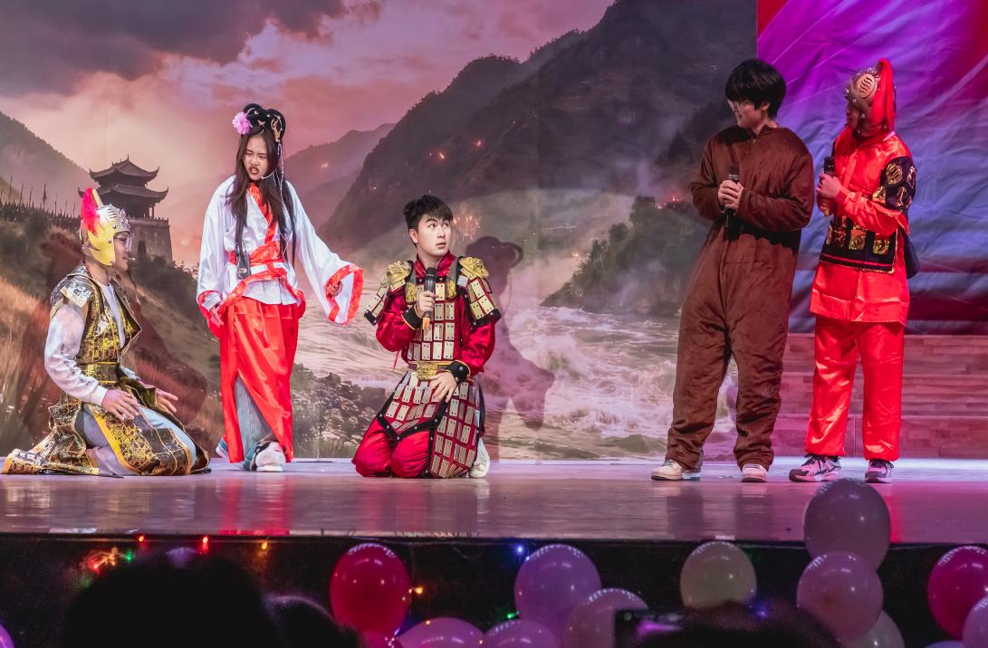 古典舞《云裳羽衣曲》随后登场,舞者身着典雅服饰,以舒展灵动的舞姿、韵味悠长的编排,将中华传统舞蹈的独特魅力展现得淋漓尽致。小品《绝境乌江之美人计》则凭借新颖的创意脱颖而出,节目以经典历史故事为蓝本进行轻量化改编,既保留了历史故事的核心脉络,又融入了诸多贴近校园生活的幽默元素。演员们自然生动的表演、接地气的台词设计,频频引发全场爆笑,成为晚会当之无愧的“气氛担当”,更在欢声笑语中传递出积极向上的人生态度。