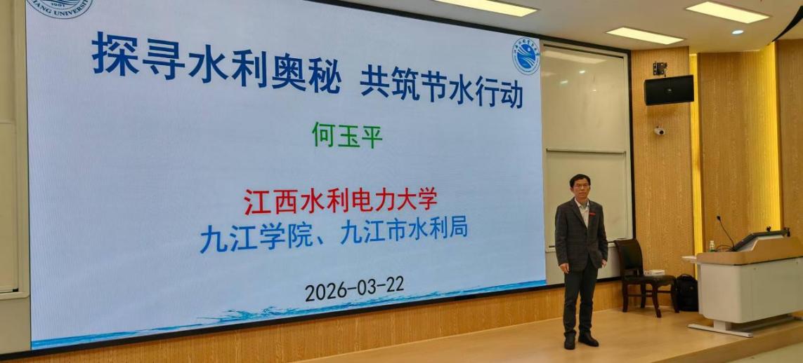2026年3月22日,恰逢第34届“世界水日”、第39届“中国水周”,由九江学院、九江市水利局联合主办,九江学院理学院、后勤管理处共同承办的“节水报告进高校”科普主题讲座在九江学院顺利举行。九江学院理学院査代奉副院长、后勤管理处杨思迪副处长,九江市水利局水资源科占铨副科长出席活动,江西水利电力大学副教授、中国科协“科普中国”专家何玉平博士受邀作《探寻水利奥秘 共筑节水行动》专题报告,理学院微电子科学与工程、物理学等专业200余名学生和部分教师参加了该活动。